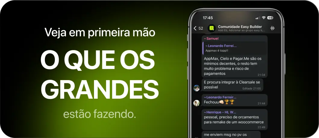 A real? A gente confia tanto no que o Easy Builder faz, que te damos 7 dias pra testar sem medo. Se não curtir, cancela e tá tudo certo. Mas se for como aconteceu com milhares de designers… Vai ser o último empurrão que você precisava pra subir de nível de vez.