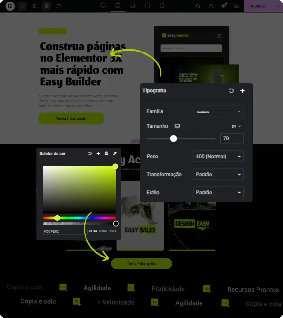 Com o Easy Builder, você escolhe o hero compatível com a copy, copia e cola no Elementor.