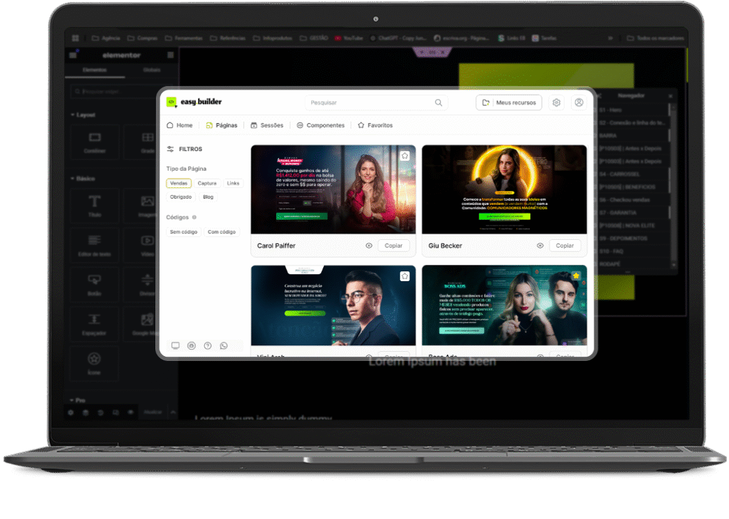 A qualidade dos seus projetos vai disparar porque o Easy Builder te dá acesso a recursos validados e otimizados para conversão. Com templates e seções que já provaram seu valor, você elimina a adivinhação e foca em criar algo que funciona.
